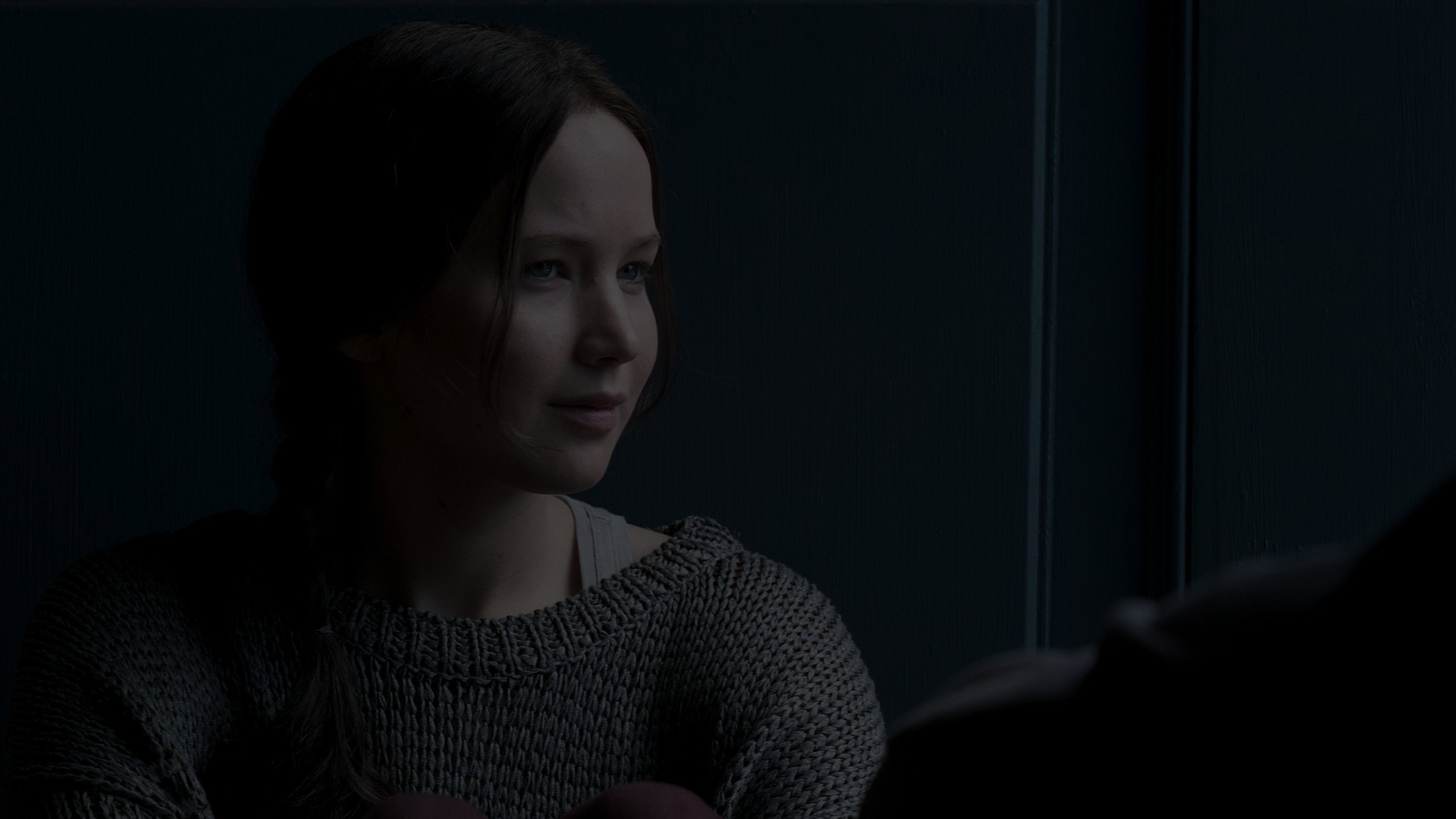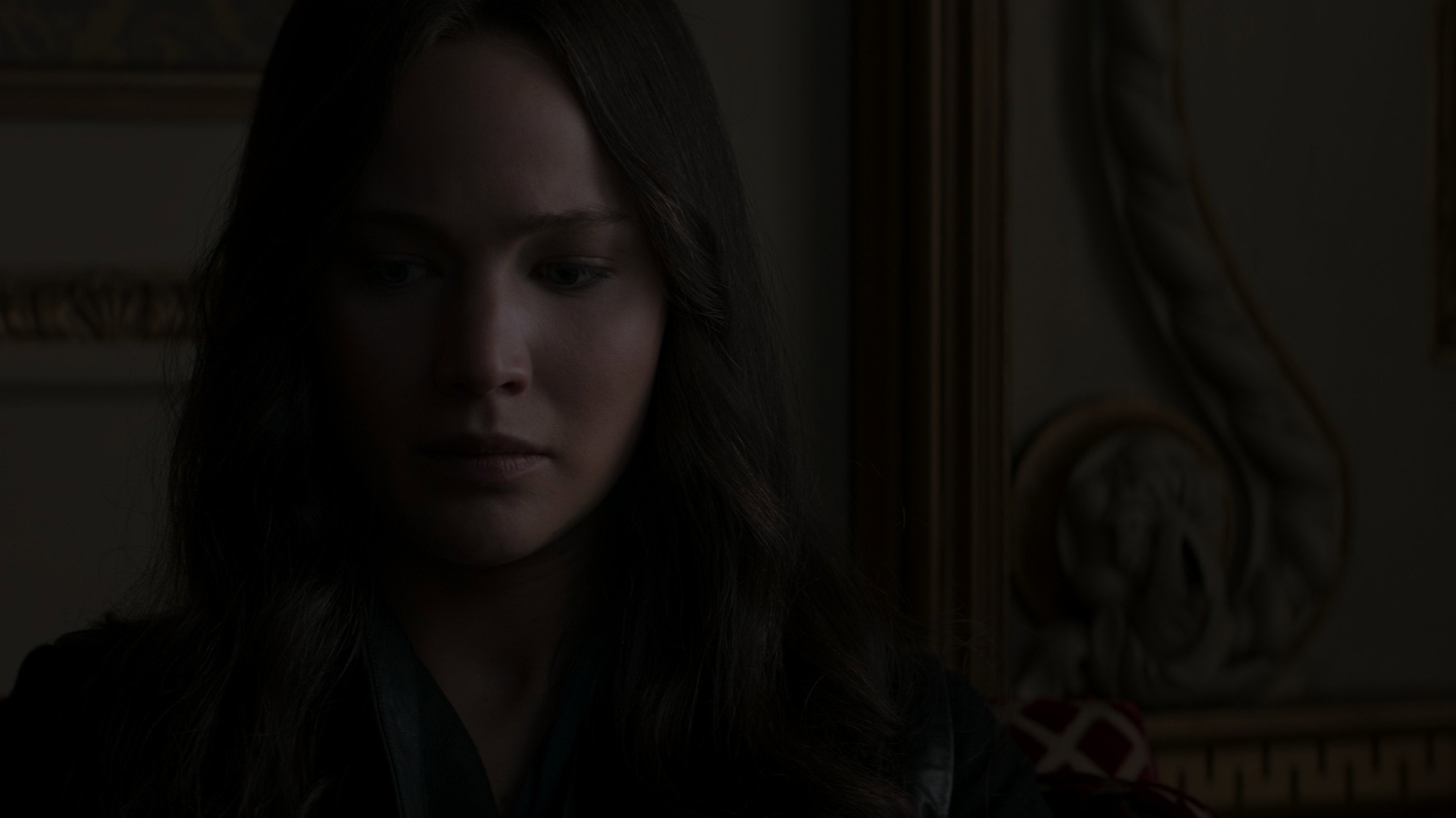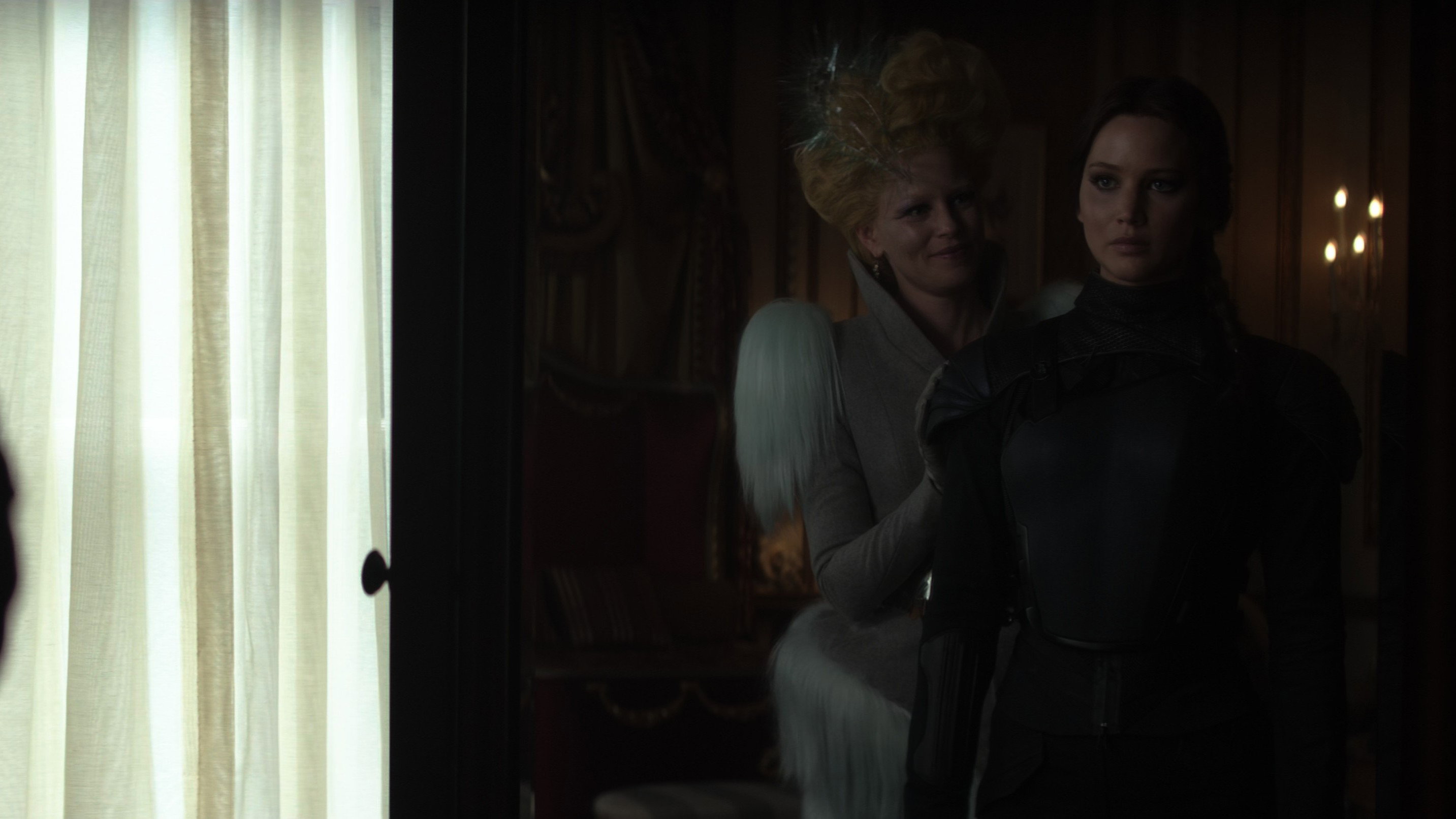 • Towards the end of the film, when Katniss and Haymitch are talking, close-ups show that Katniss’s costume has a large copper slider on the zipper, but this slider is not present in wide shots.