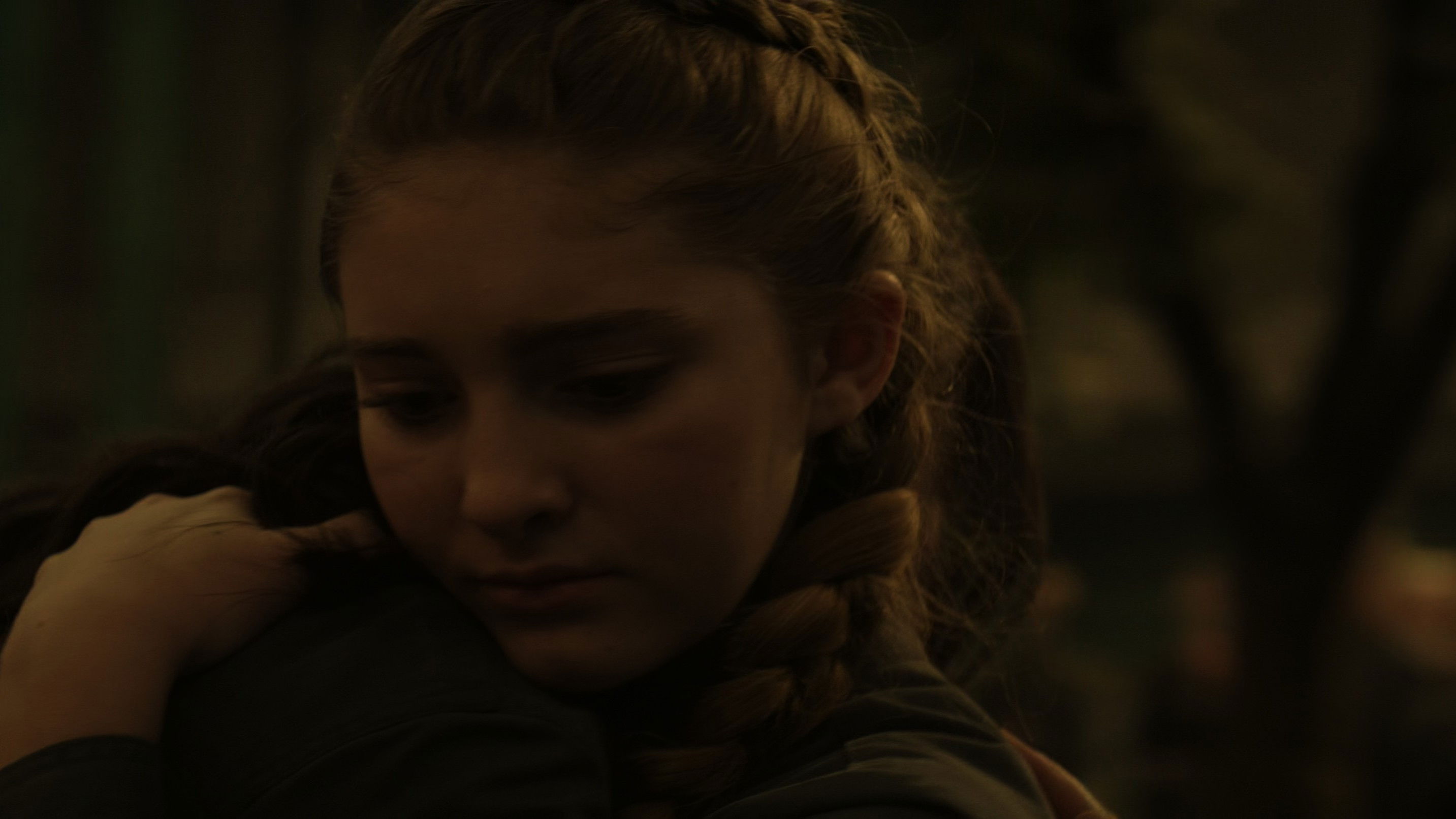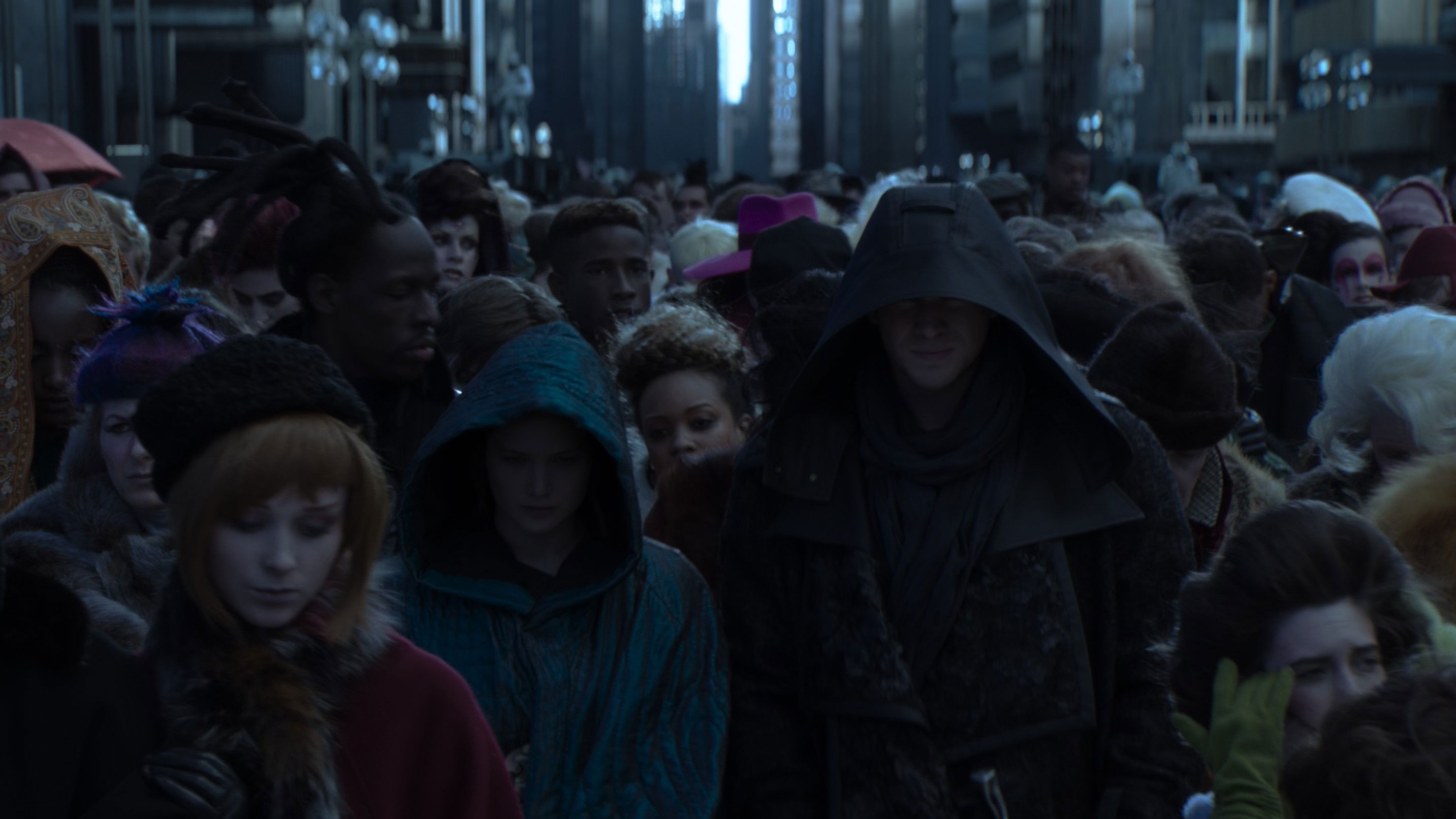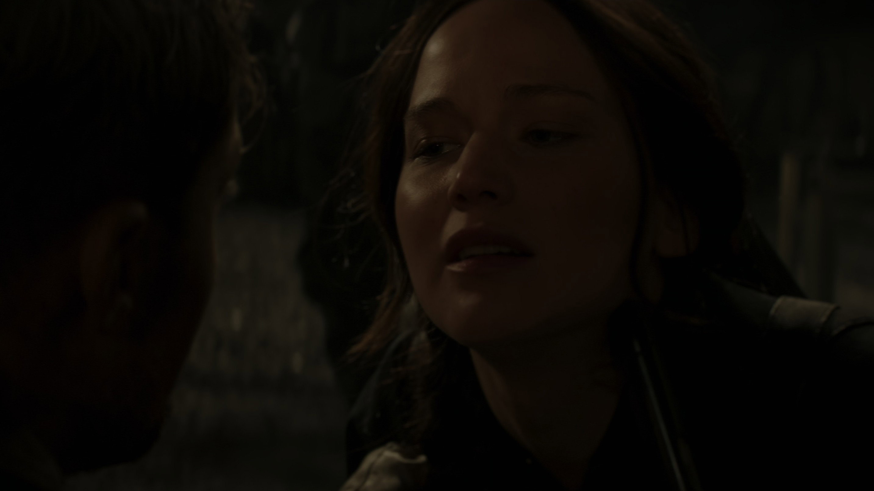 • When Katniss is talking to Boggs alone in the square, the camera shows her face and then Boggs' face, and during the change of shot, Katniss’s hair is sometimes on the hood and sometimes completely under it.