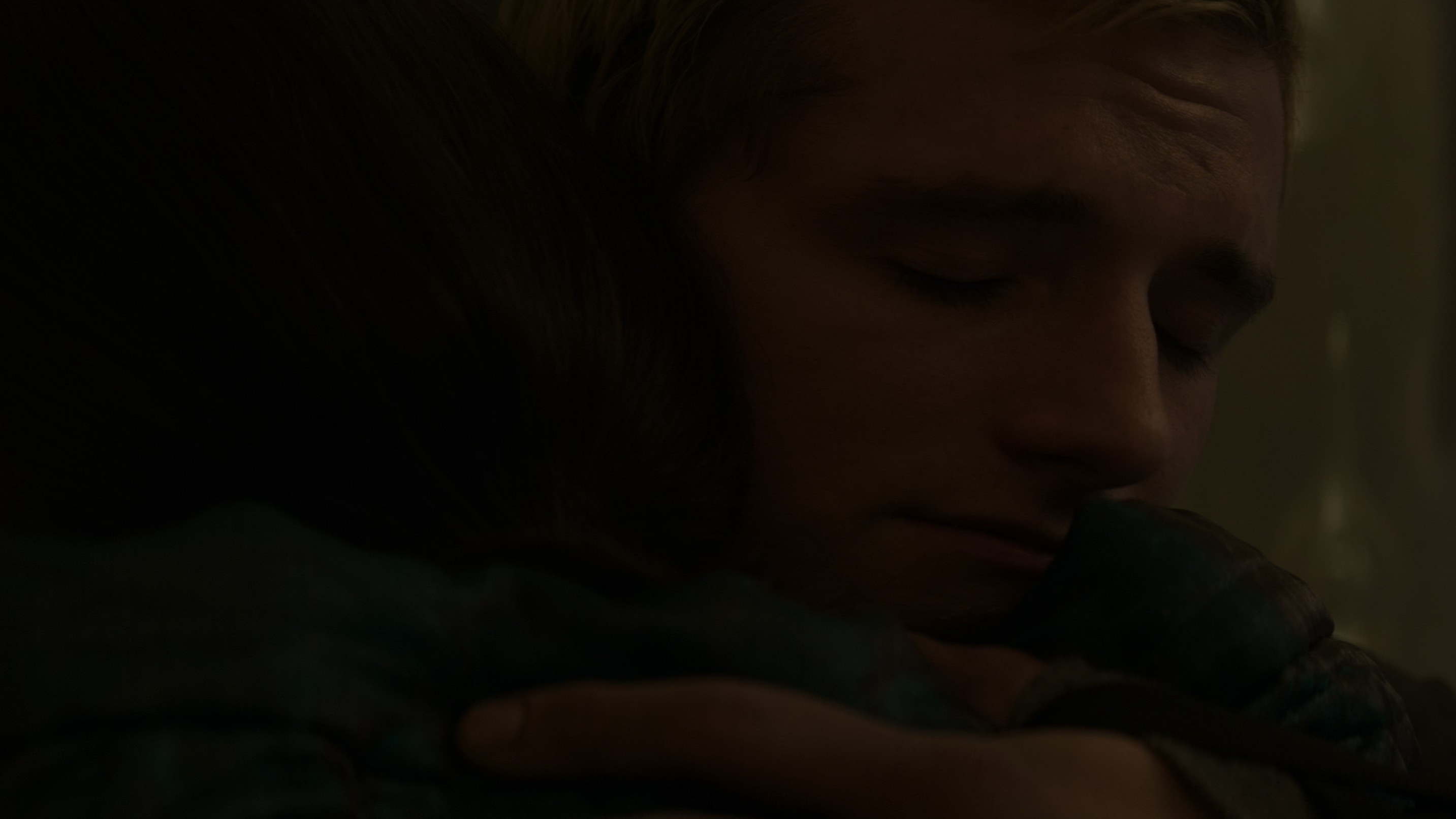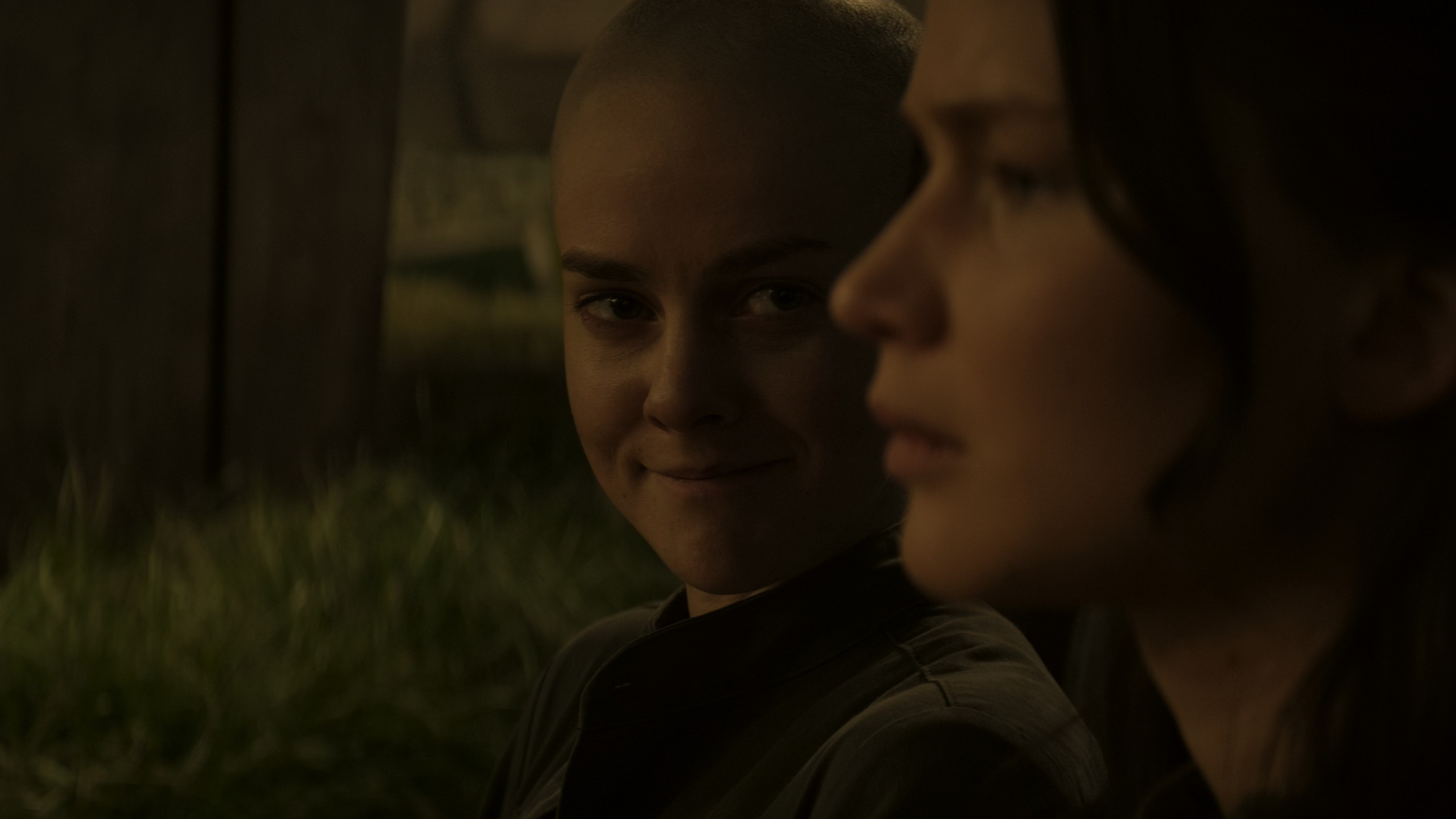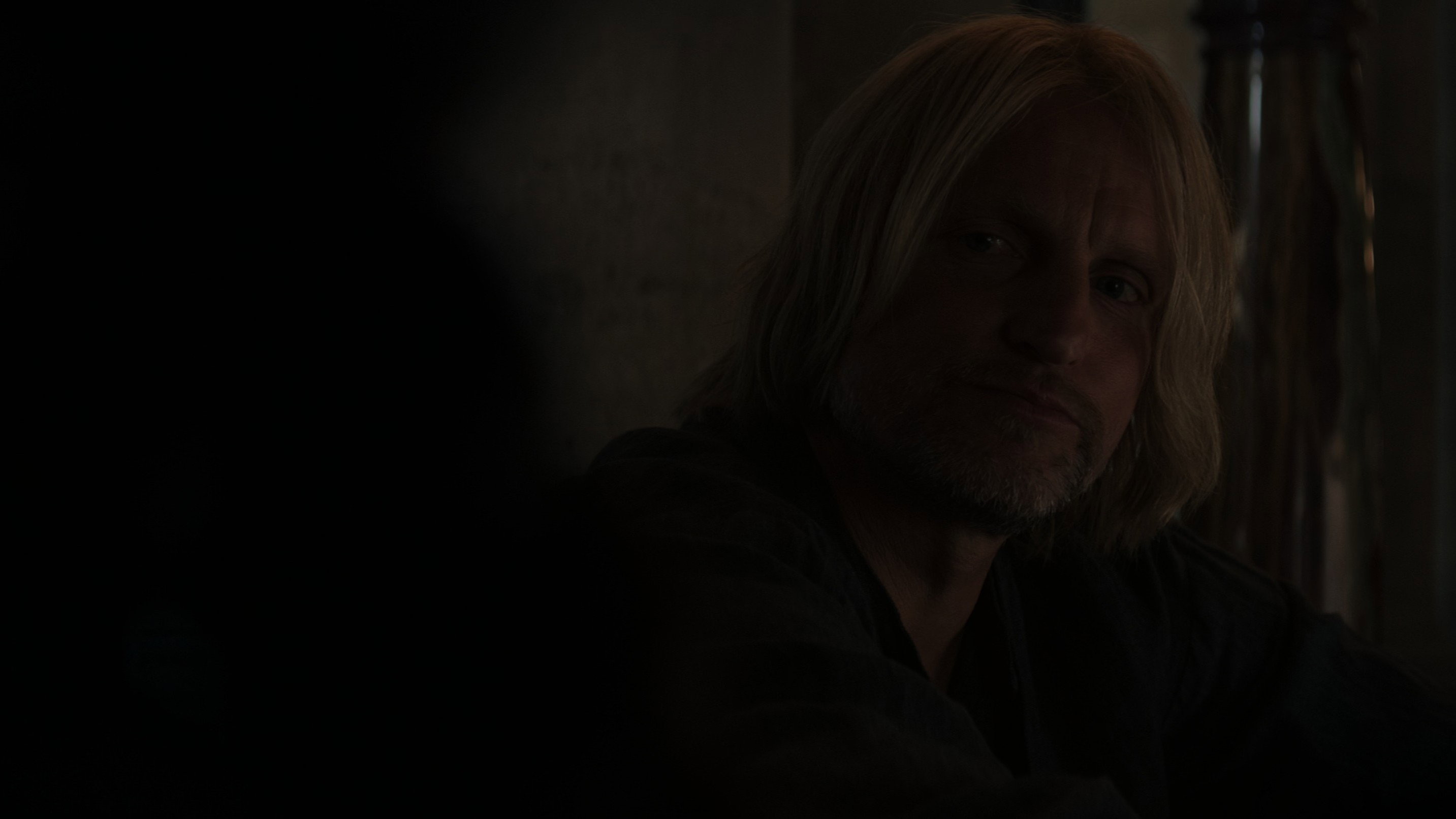 • When Katniss is talking to Boggs alone in the square, the camera shows her face and then Boggs' face, and during the change of shot, Katniss’s hair is sometimes on the hood and sometimes completely under it.