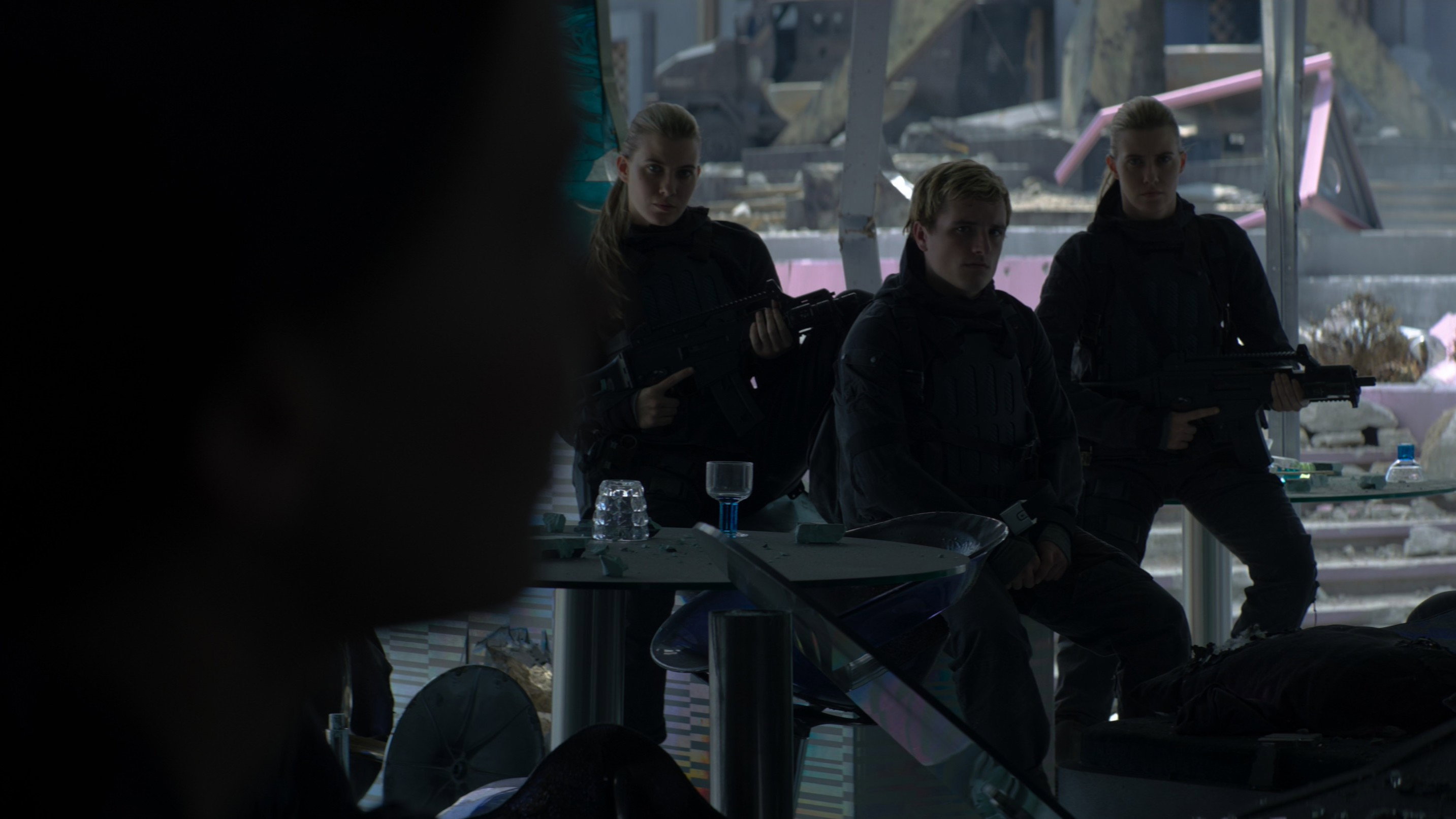 • Boggins and his men accompany Katniss, armed with Gewehr 36C 5.56mm caliber automatic rifles from «Heckler & Koch». This is standard armament for the Bundeswehr, which is also used by police forces in many countries around the world. The rifles in the film are set to safe (when taken off safe, the firing mode can be selected – single shots, bursts of 3 shots, and full automatic fire).