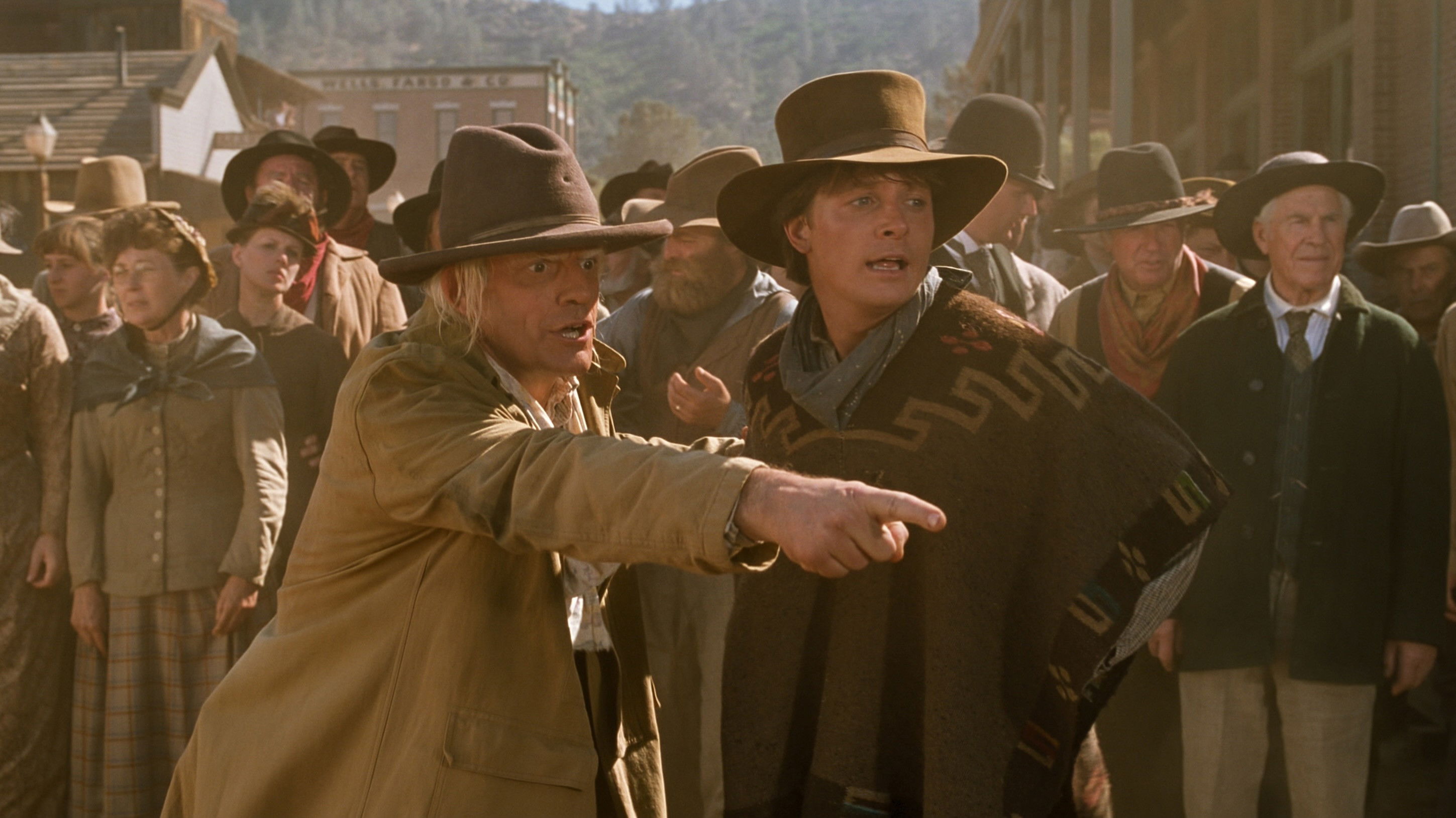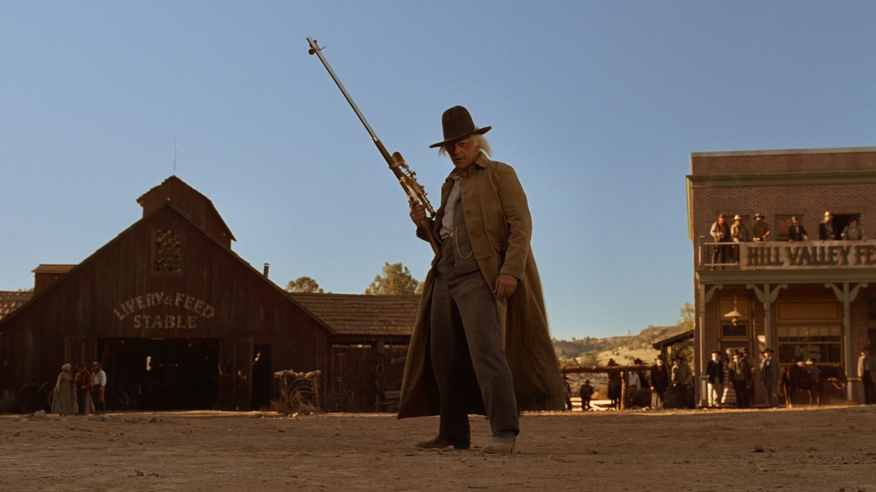 • When Marty enters the town from the railway station side, the camera slowly rises above the station and shows Marty in the distance walking through the town. This scene is a frame-by-frame reproduction of a scene in the film "Once Upon a Time in the West" (1968), in which Jill arrives at the station.