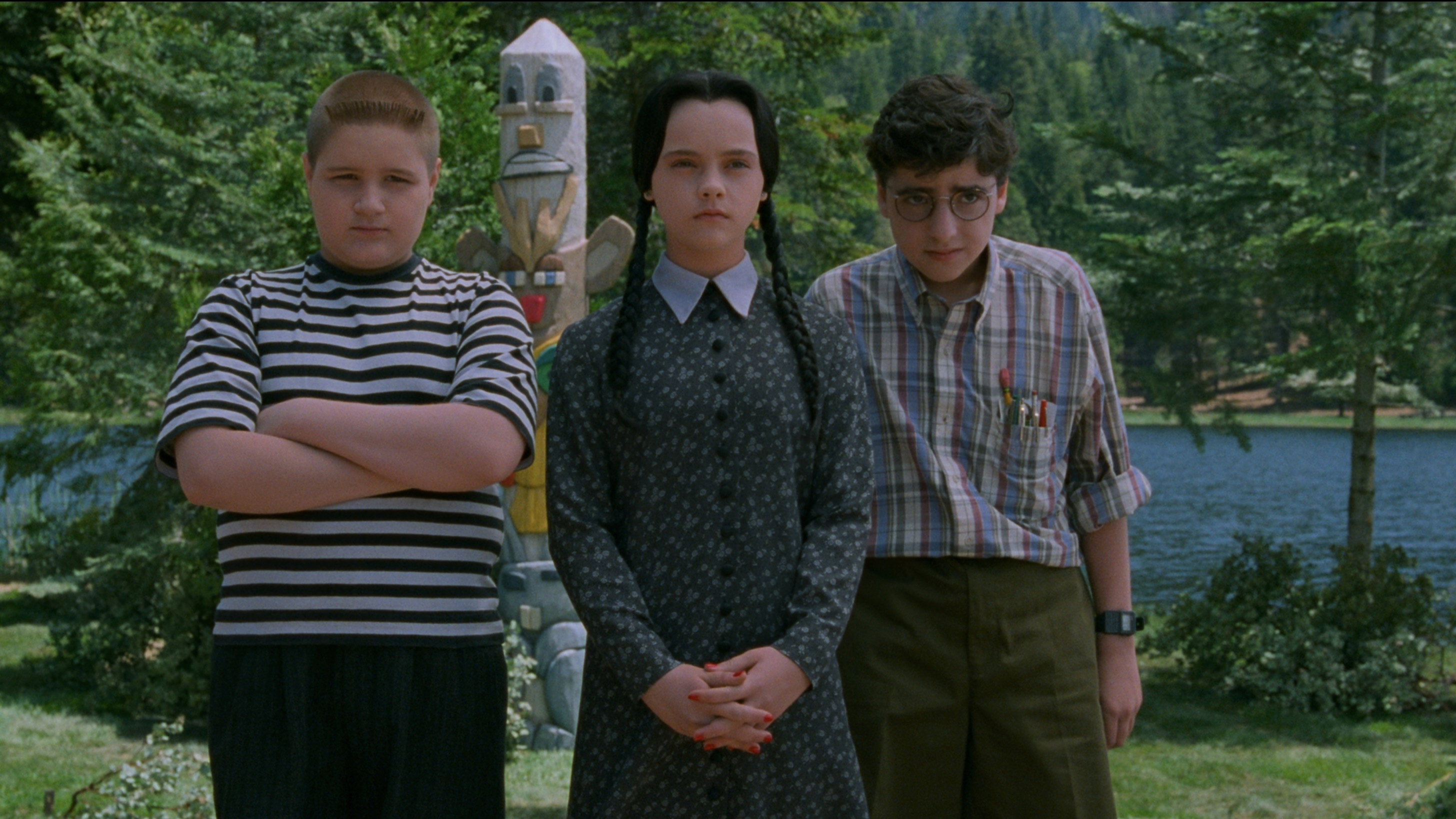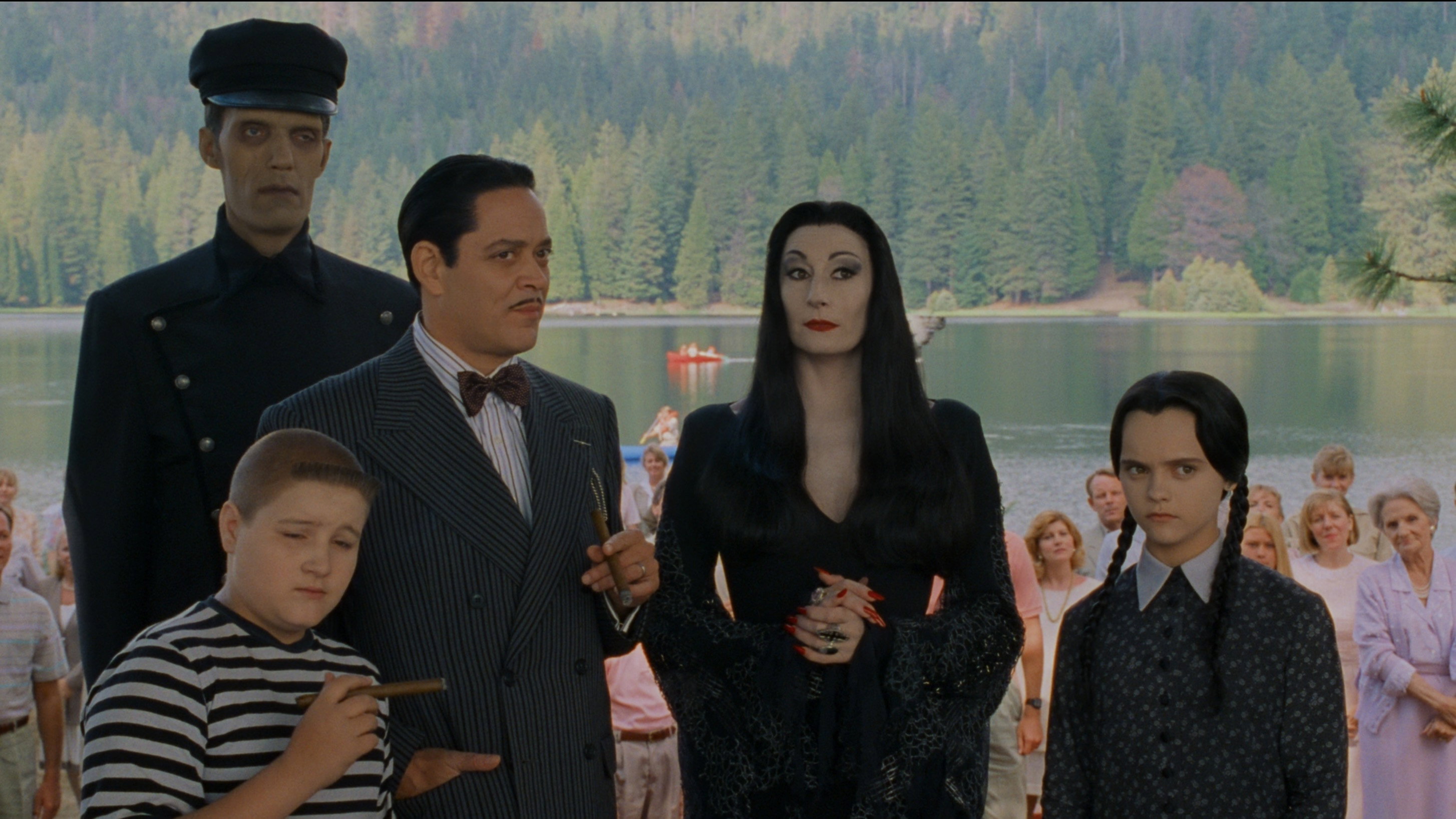 • Wednesday and Pugsley are shown in old-fashioned Victorian-era swimsuits from approximately the late 1800s – early 1900s. The film also includes other references to roughly the same period – ranging from the characters’ black wardrobe items to interior design elements. Very few modern interior items are shown (for example, the television that Debbie is watching).