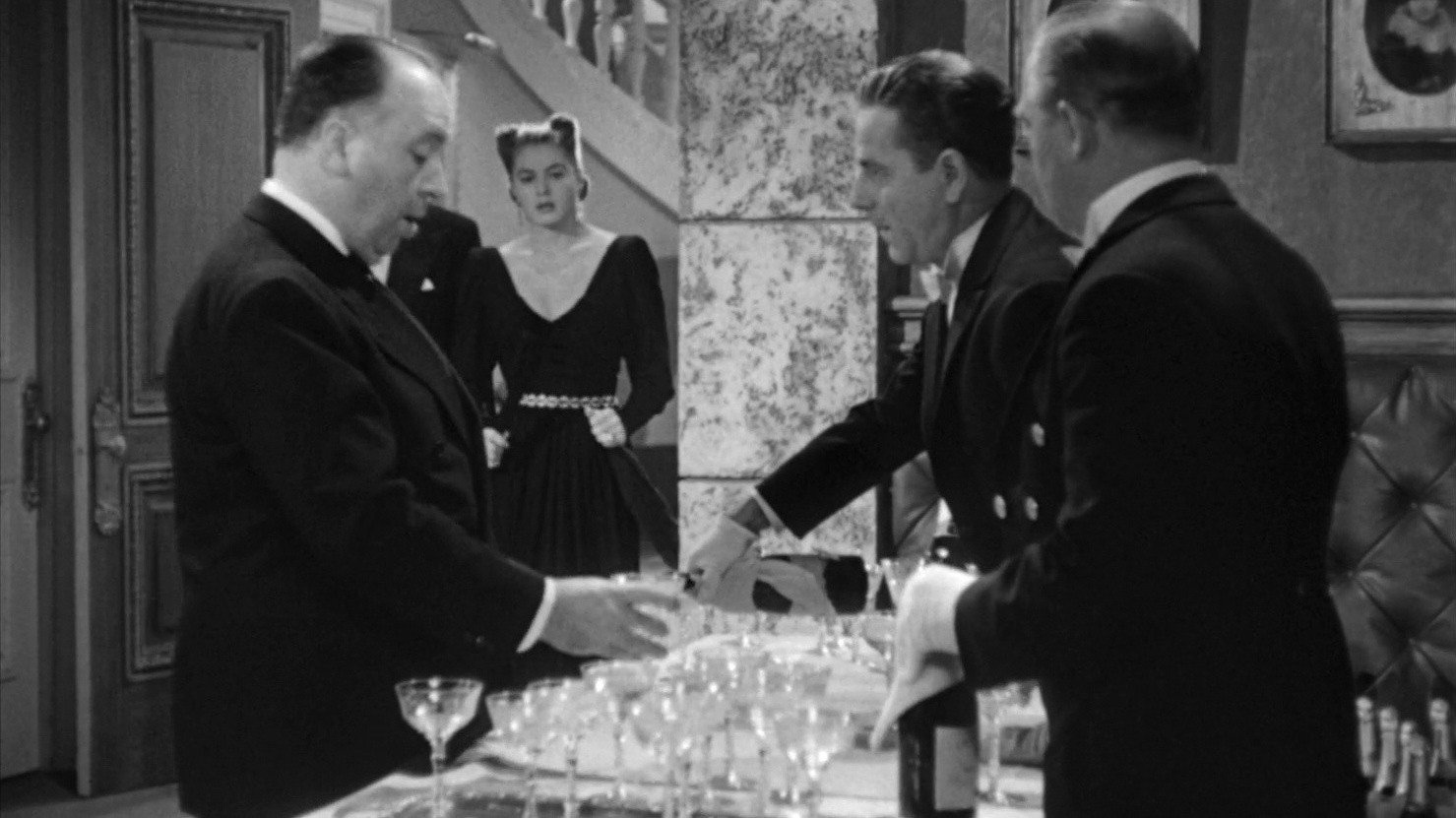 • The director's cameo (at 60 min.) – Hitchcock appears at a large reception at Alex Sebastian's house. He is one of the guests, drinking champagne.