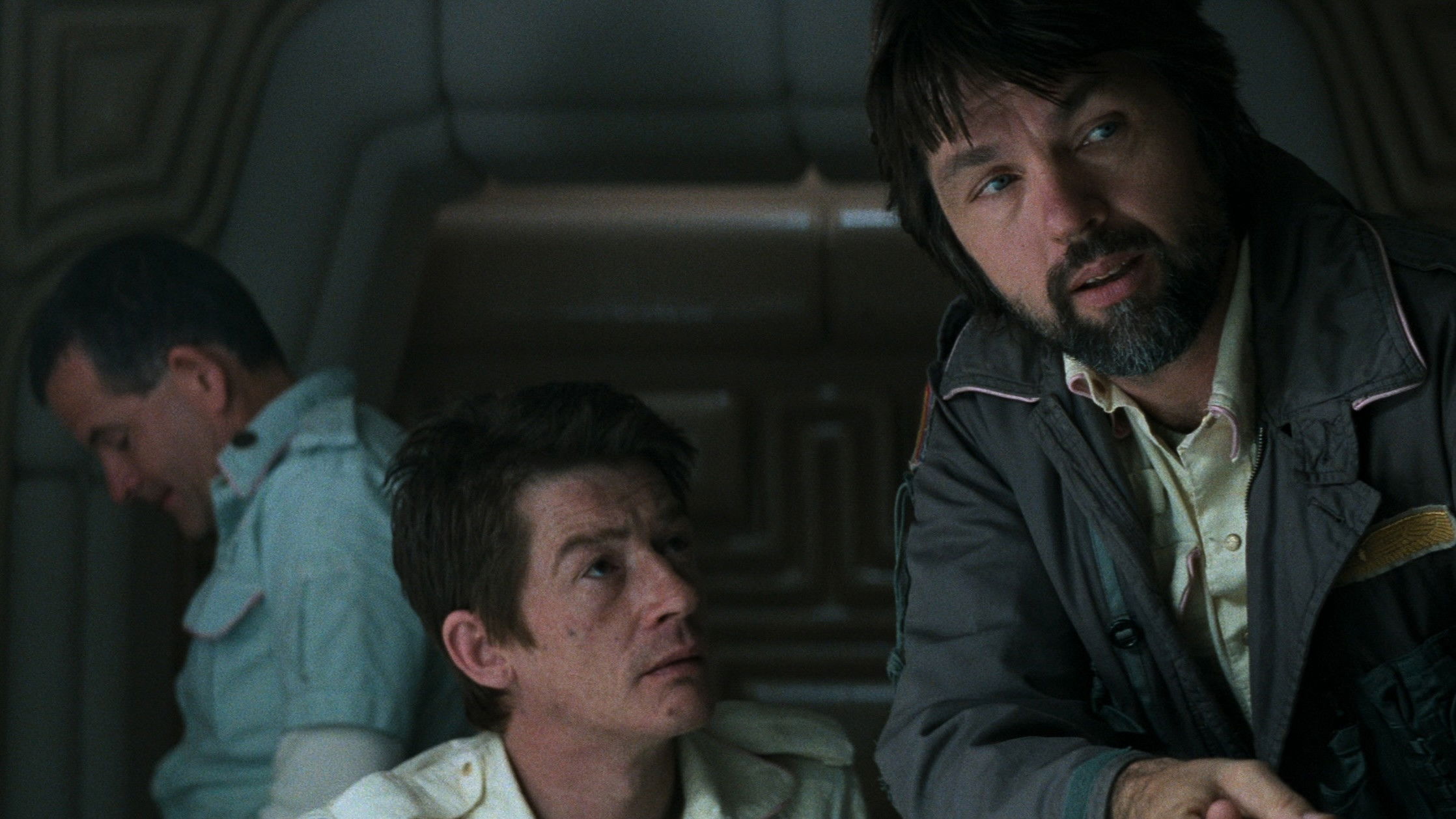 • Scenes that were not included in the theatrical release, but were in the director's cut: At the very beginning of the film, there were two additional shots showing the external design of the tug. After Kane wakes up at the very beginning, he puts on a robe, goes to the dining room, turns on the coffee grinder, and greets Lambert, who has entered. Lambert is not shown in the frame and says nothing; in the script, Kane greets the other crew members as they enter one by one. The 'Nostromo' crew, standing on the bridge, listens to that mysterious signal and learns from which planet it originates. A scene of entering the alien ship and shots showing the alien ship from a different angle as Lambert, Dallas, and Kane approach it. Dallas, Kane, and Lambert find the body of the alien pilot. A scene of setting up the winch, preceding Kane’s descent into the underground tunnel. Lambert and Dallas carry Kane into the 'Nostromo’s' airlock. A confrontation between Lambert and Ripley over the latter's refusal to allow those who had gone to the planet’s surface to board the ship. Ripley asks Lambert what happened to Kane. Lambert recounts Kane’s words about the Alien eggs in the hold of the alien ship. The crew enters the medical bay and examines Kane. Lambert notices a spot on the scanner screen in Kane’s chest. A conversation between Parker and Brett in one of the auxiliary compartments during repairs. The crew discusses ways to find the Alien on the ship, after which Parker and Brett go to make an electric shocker. A bed scene between Ripley and Dallas. The death scene of Brett was described differently in the script. The Alien inserted its tail between Brett’s legs and thrust its stinger into the back of his head. This shot was filmed, but for some reason it was inserted into the scene of Lambert’s death. Subsequently, the concept of this scene was depicted in a comic book published by 'Heavy Metal'. There was an alternative version of Brett’s death scene: a growling Alien crushes his head with its paws, with blood gushing from it. After the Alien drags Brett away, Ripley and Parker run into the compartment. Blood drips onto Parker’s T-shirt from above. Before going to talk to Mother, Ripley comforts Lambert, asking if she slept with Ash. A long scene where the crew tries to lure the Alien into the airlock and throw it into space, but the plan fails because an emergency alarm suddenly goes off and the Alien escapes. Ripley suspects that Ash activated the signal. Lambert calls Ash over the communicator. Ripley discovers the cocoons with Dallas and Brett and burns the still-alive Dallas and the rest of the Alien’s activity with a stream of flame from a flamethrower. Before his death, Parker shouts to the Alien: “I'm going to kill you, you freak!” To insert new scenes, Ridley Scott cut 10-15 seconds from many scenes in the theatrical release: The dialogue between Ripley and Ash about decoding the signal with the computer. The scene of exploring the Space Jockey ship. The conversation between Ripley and Dallas about Ash. Dallas asks the ship's computer how to destroy the Alien, but receives no answer. The initial search for the Alien. The search for the Alien in the ventilation system. Ripley gaining access to 'Mother'. The preparation of Ash for interrogation. All of the ending—frames were cut from each scene.