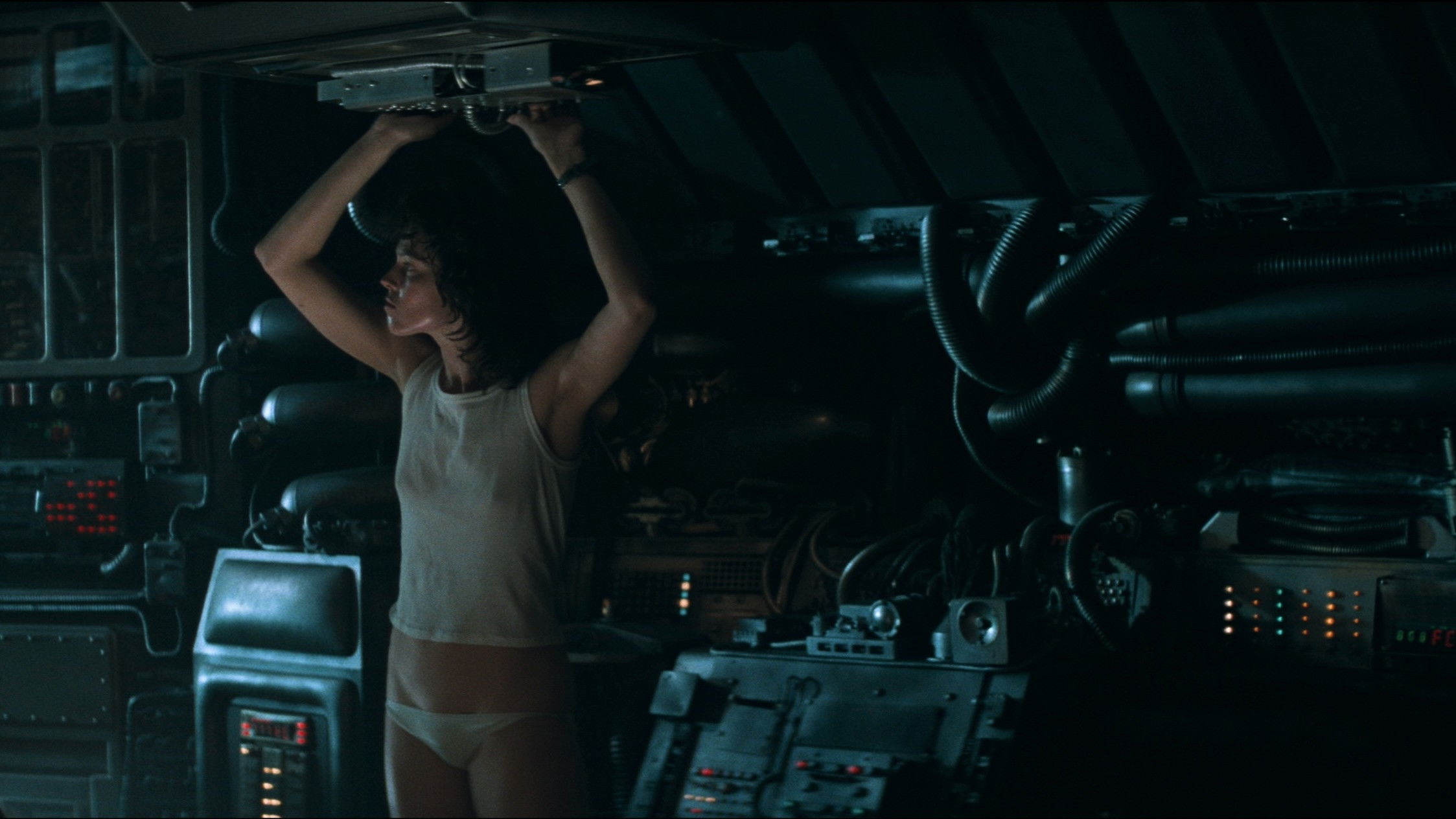 • In the scene where the “Nostromo” crew awakens from hypersleep, the chests of Veronica Cartwright and Sigourney Weaver were covered with canvas tape.