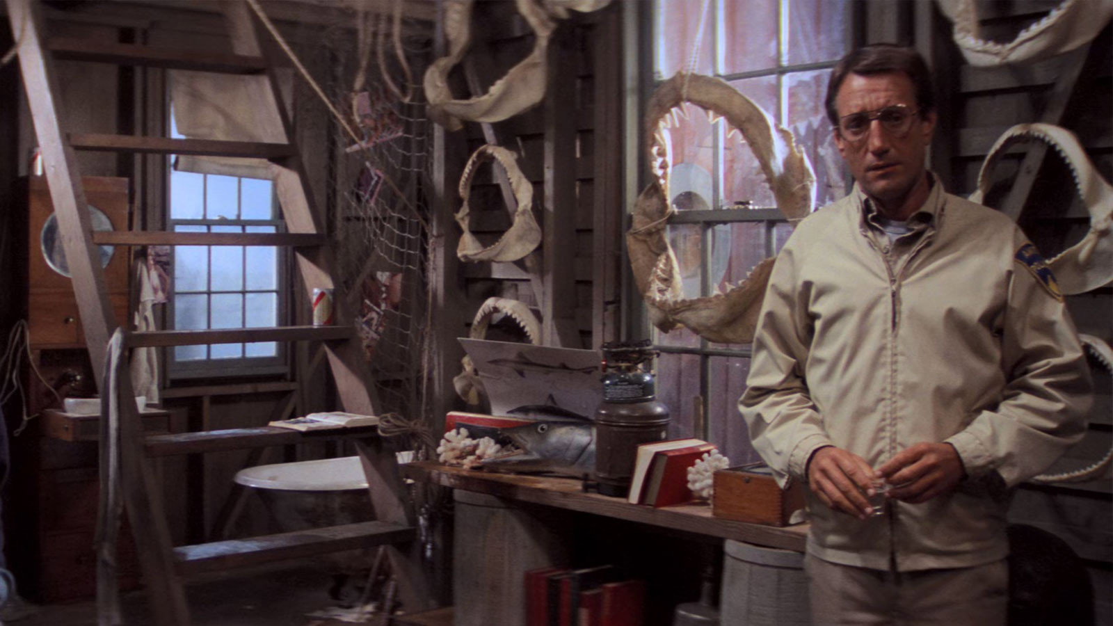• Quint's house for the film was built in a remote location on Martha's Vineyard, but the island municipality insisted that the crew dismantle and destroy the structure after filming, as it resembled a garbage dump more than a dwelling.
