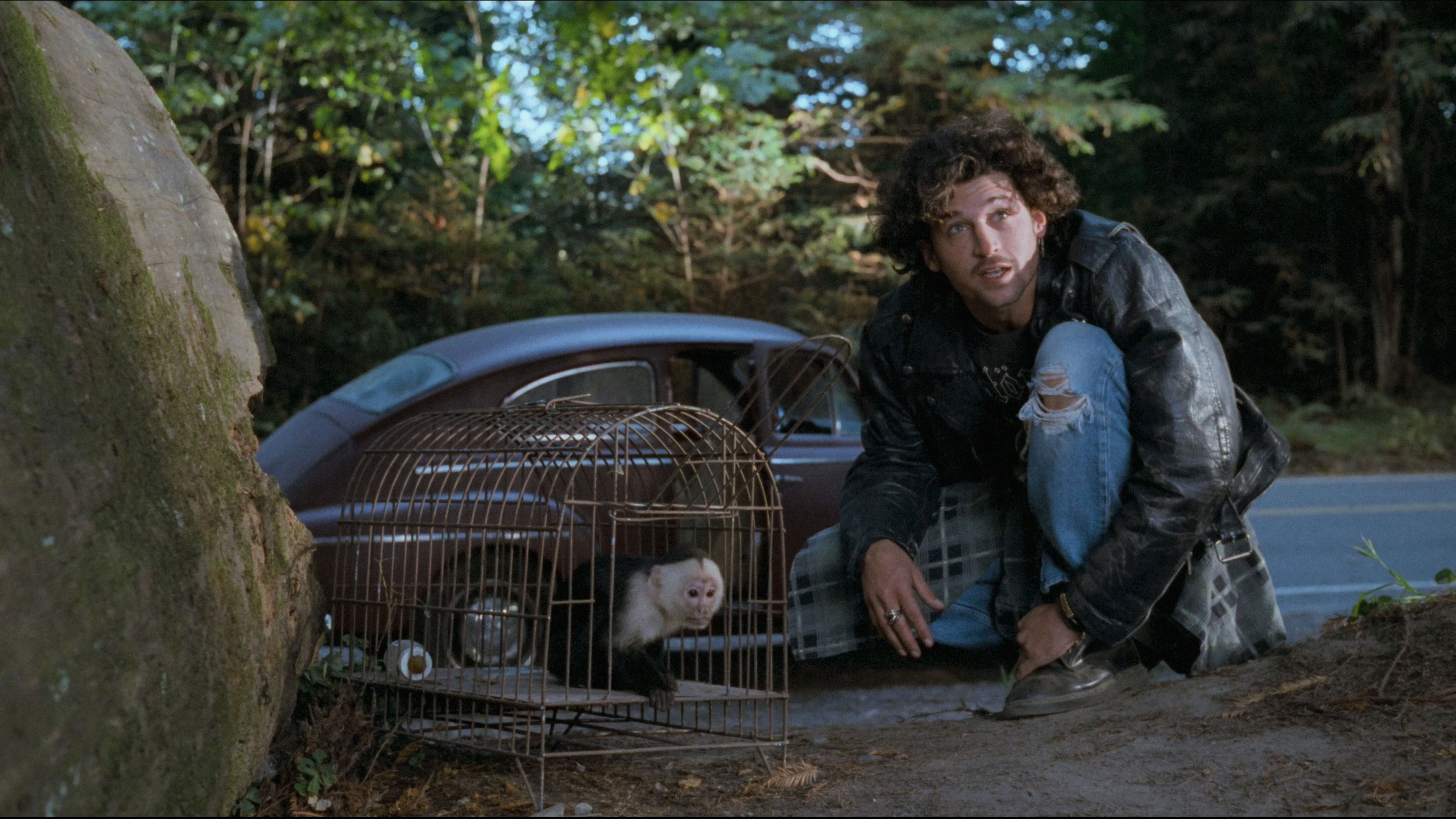 • In the car scene, the monkey is shown in a cage in the back seat. In reality, this scene was filmed on a soundstage, so the car remained stationary. The cage had no bottom to give the animal more freedom. Before the scene where the monkey spits at the man, water was injected into the animal's mouth with a syringe, and then the trainer gave the command to spit it out.