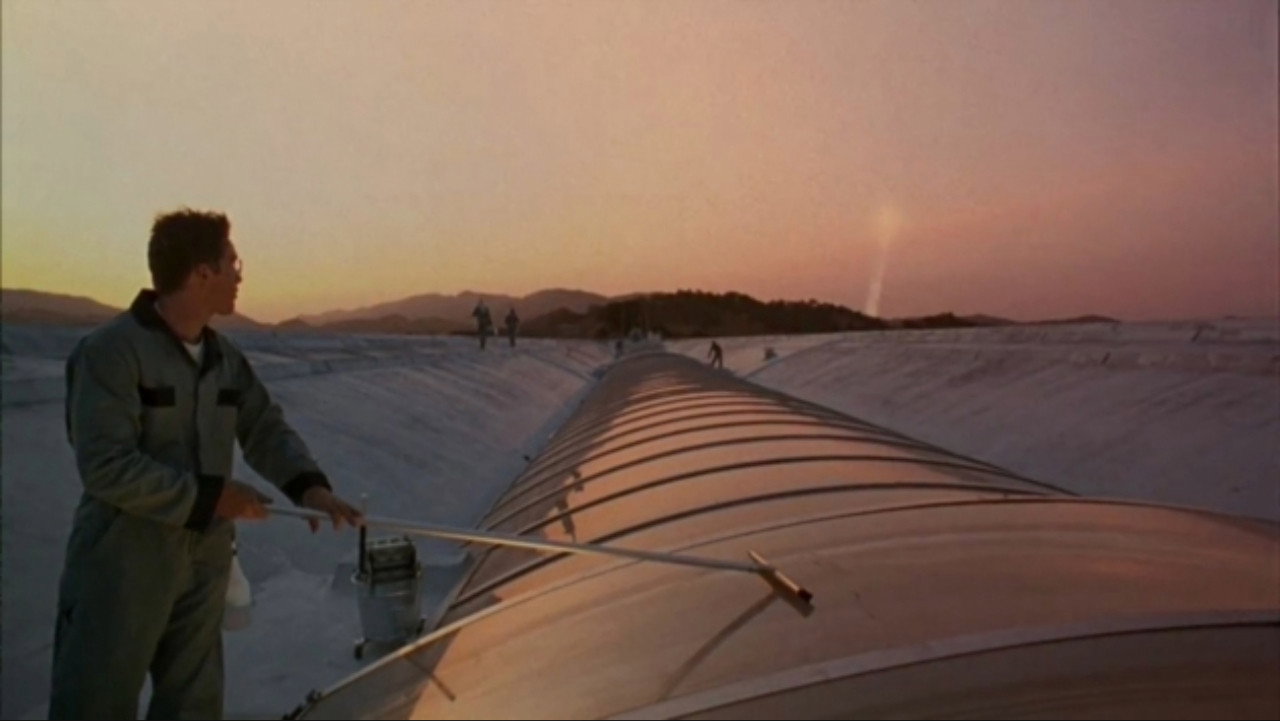 • Many of the 'futuristic' buildings in the film are actually quite old. Most of them are built in an architectural style called 'Brutalism,' which was popular in the 1950s. The two giant arches visible in the background during the conversation between Jerome and Irene are actually the spillway of the Sepulveda Dam in Los Angeles, built in the 1930s.