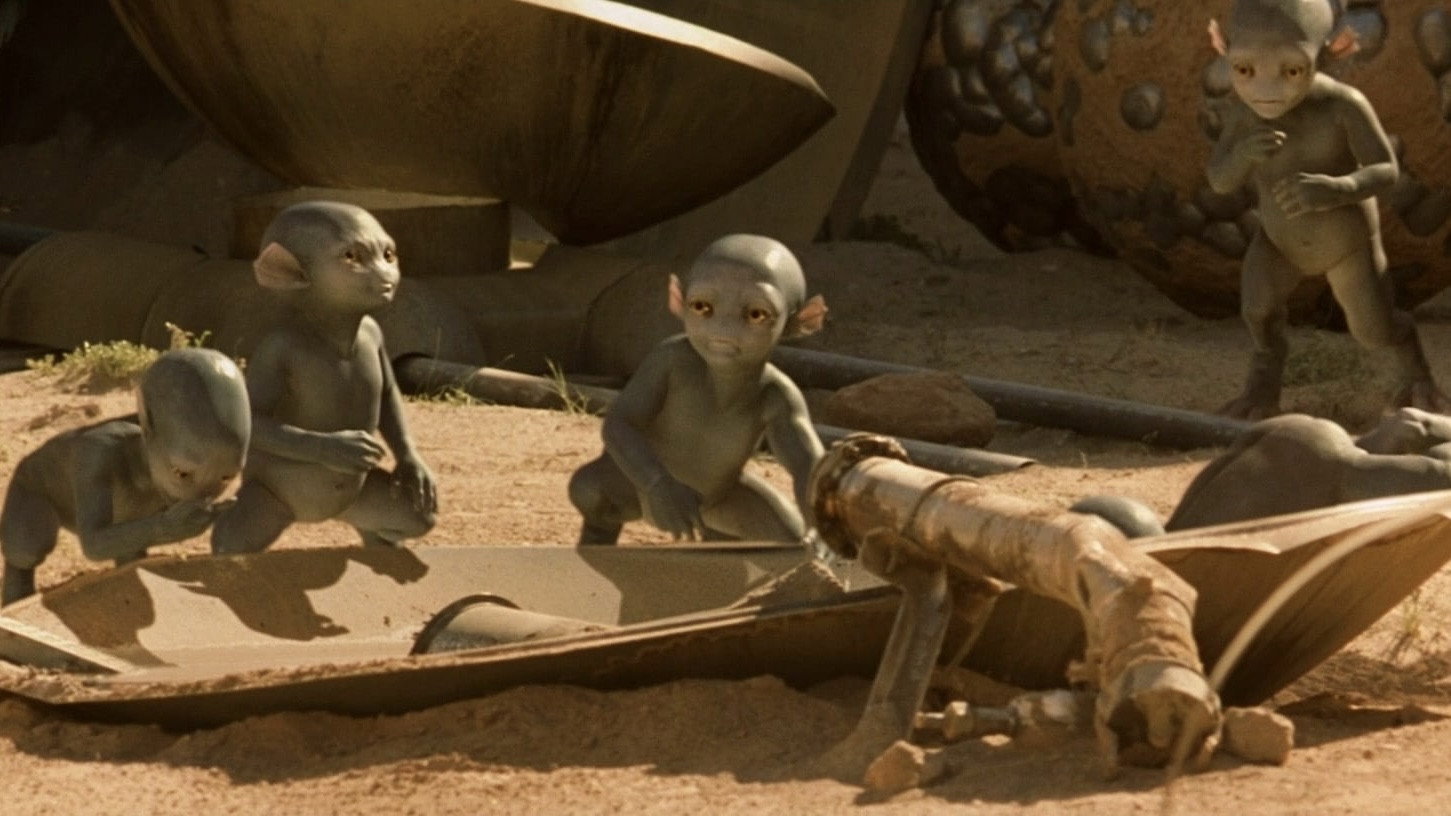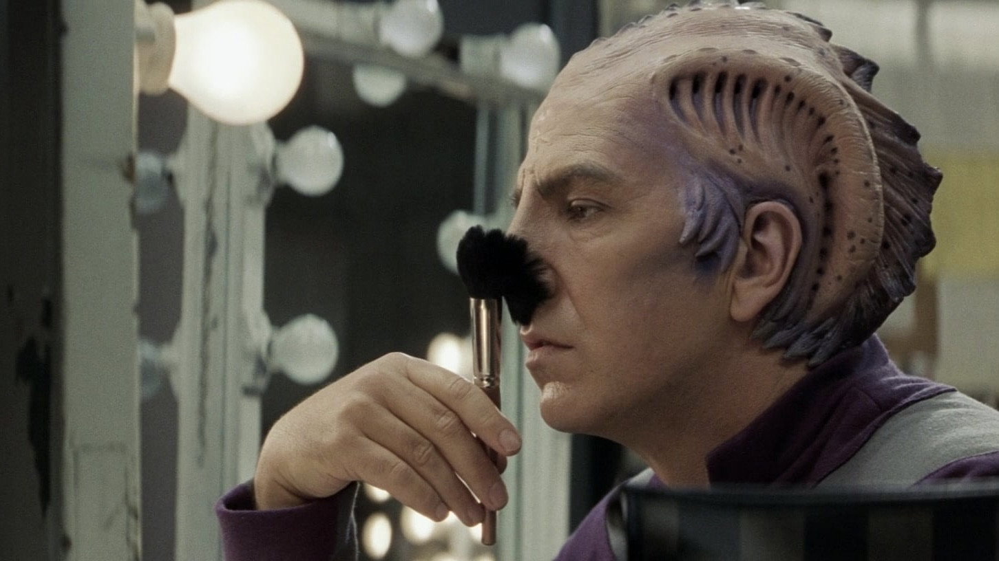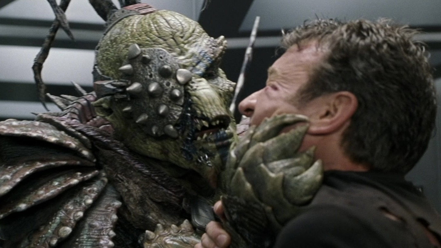 • For the reptiloid Sarris, they decided to use technology originally developed for the then-in-production 'Planet of the Apes' project. It allowed them to transfer the actor's facial expression onto the outer contour of the makeup. Stan Winston (1946-2008) worked on this task ever since he created the Wookiee heads 20 years earlier for 'The Star Wars Holiday Special'.